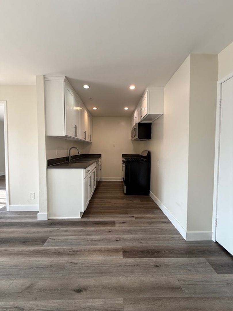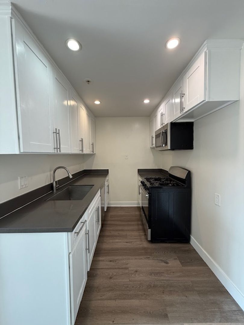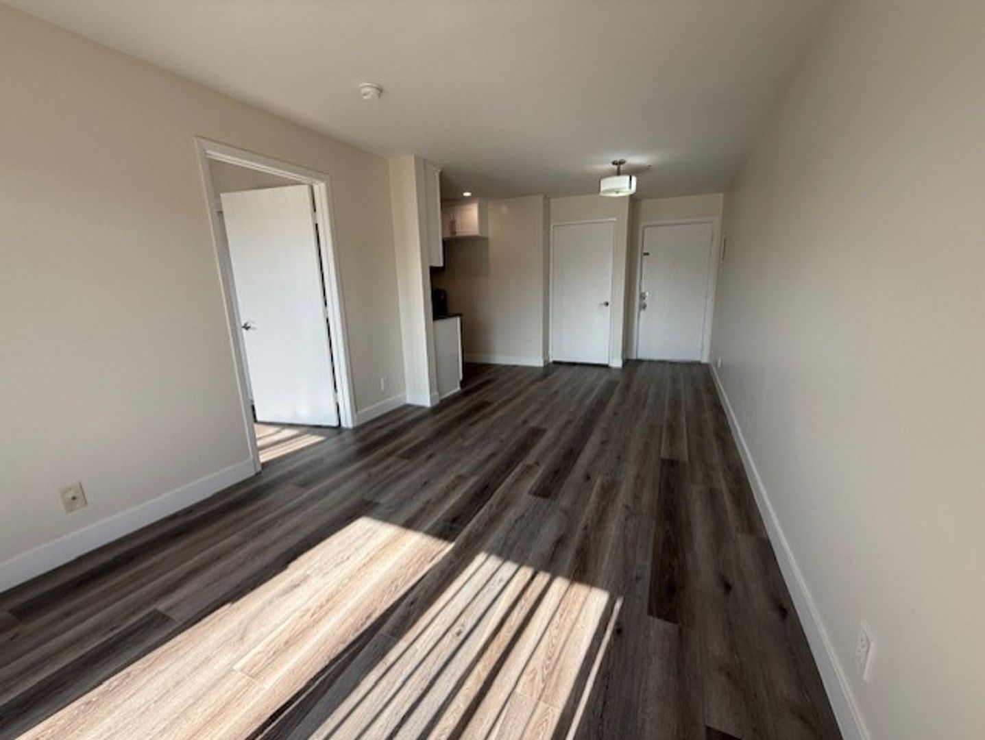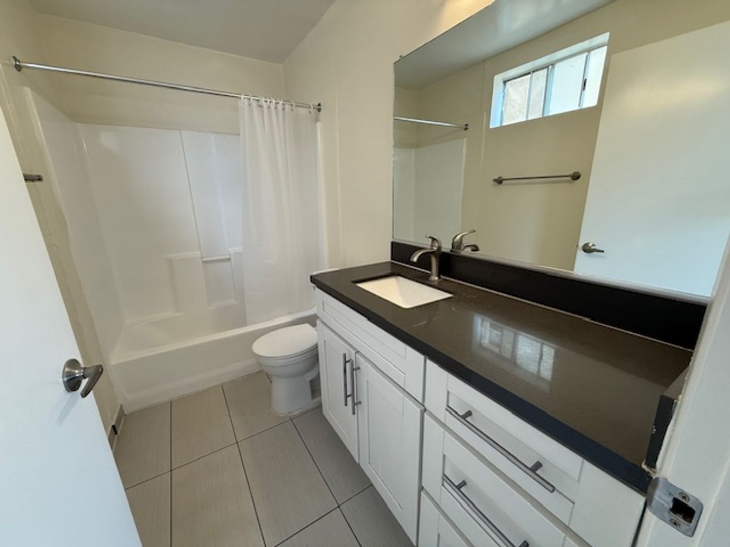 Renovated one bedroom unit with grey slate flooring throughout the living room and bedroom. Beautiful white/greyish flooring to match the white cabinets and grey countertops in kitchen and bathroom.