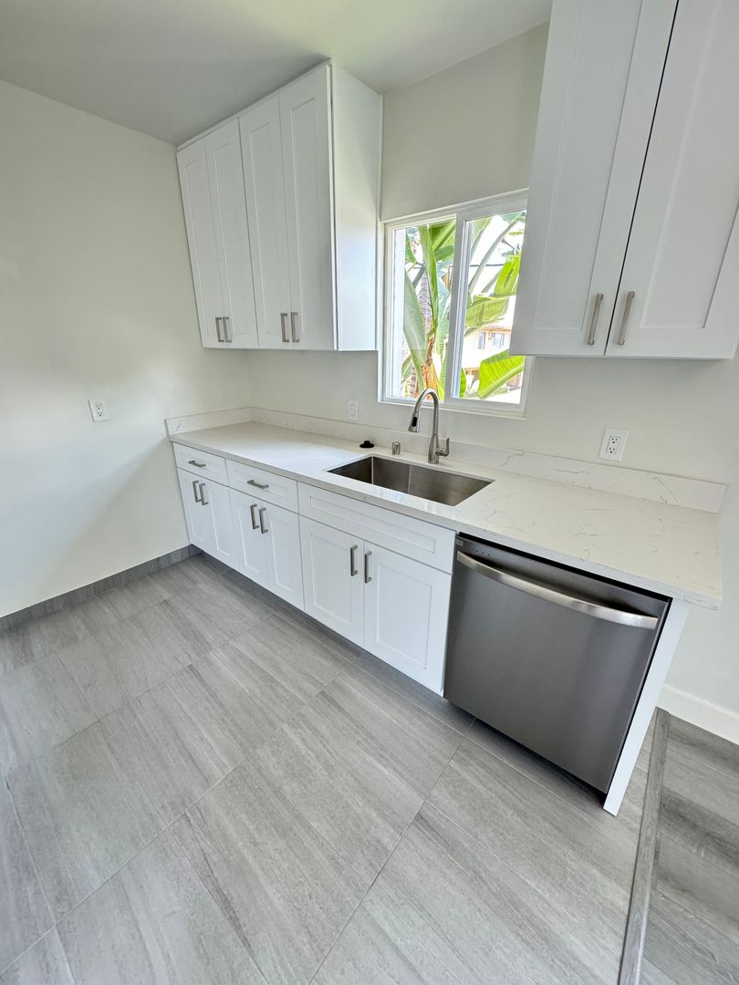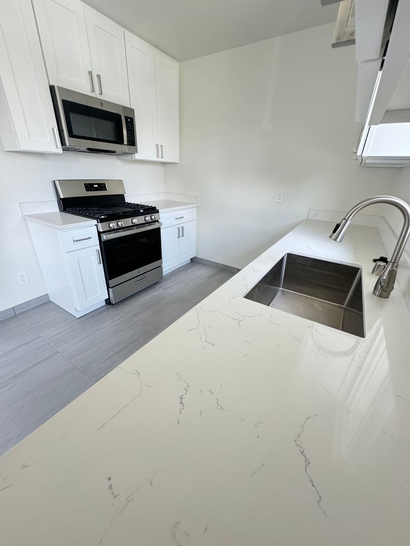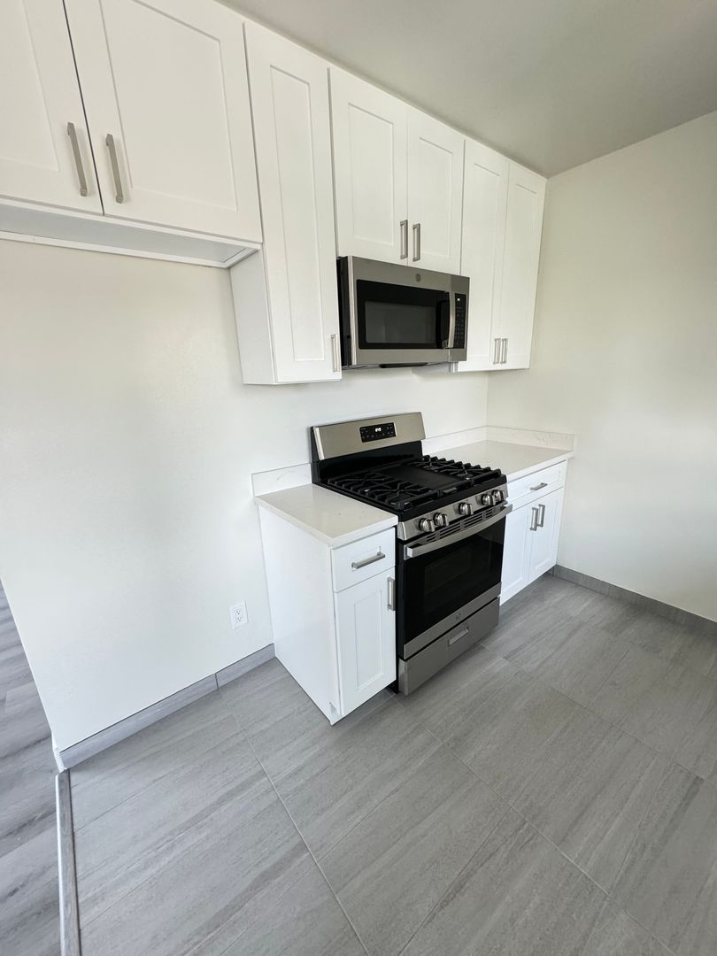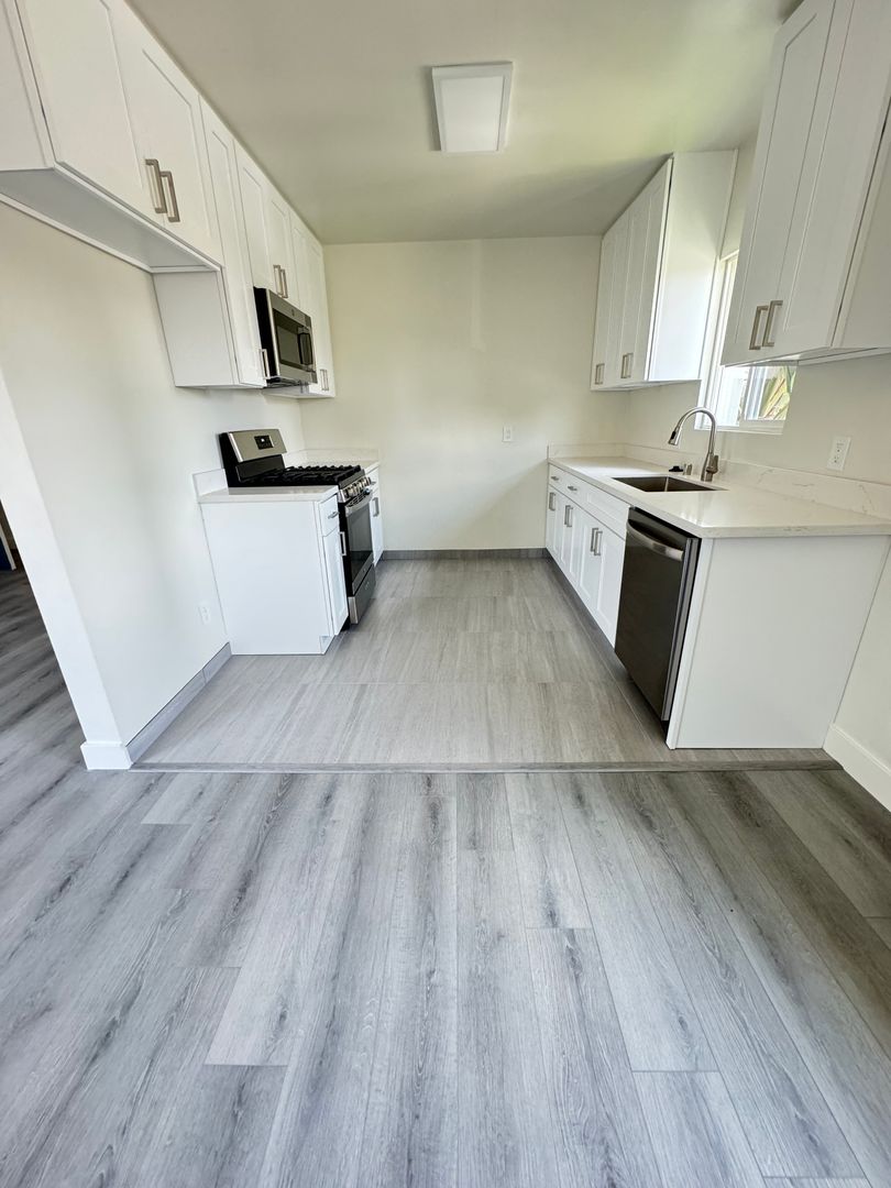 Freshly painted kitchen and quartz countertops with lots of storage, appliances include stainless steel gas stove, refrigerator, dishwasher, microwave.