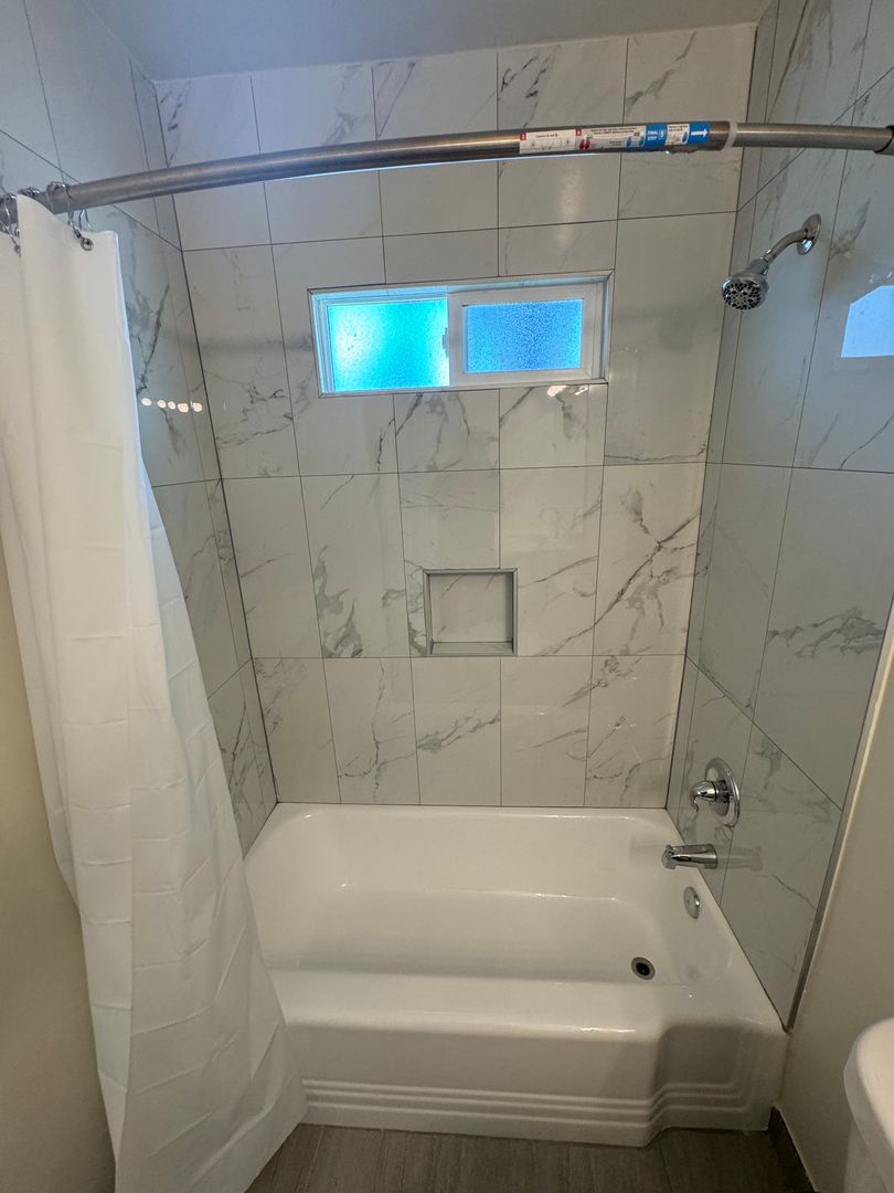 Bathroom is tiled and includes a bathtub and shower.