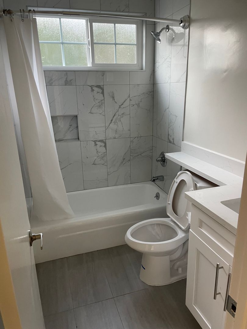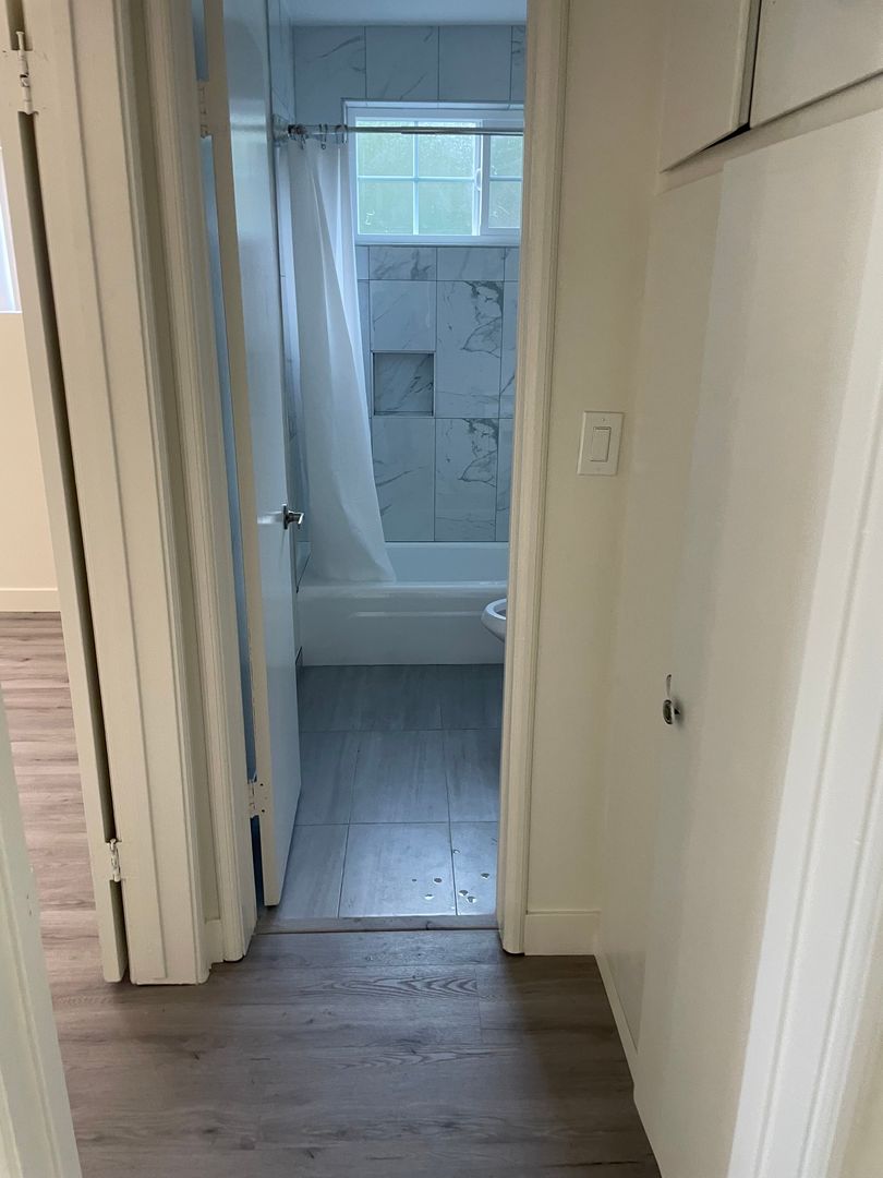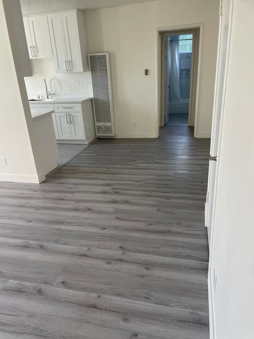 Newly renovated one bedroom unit with grey slate flooring throughout.