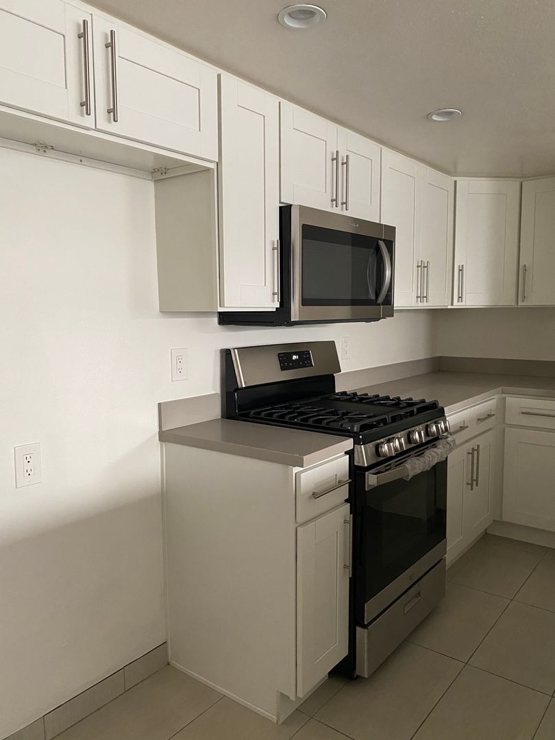 Freshly painted kitchen and new stone countertops with lots of cabinets, appliances include stainless steel gas stove, dishwasher, and microwave.